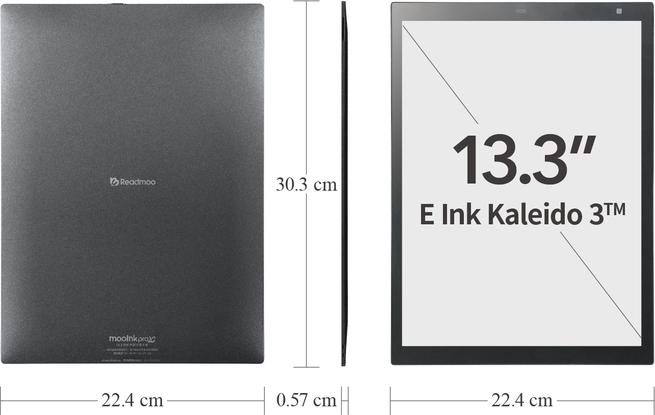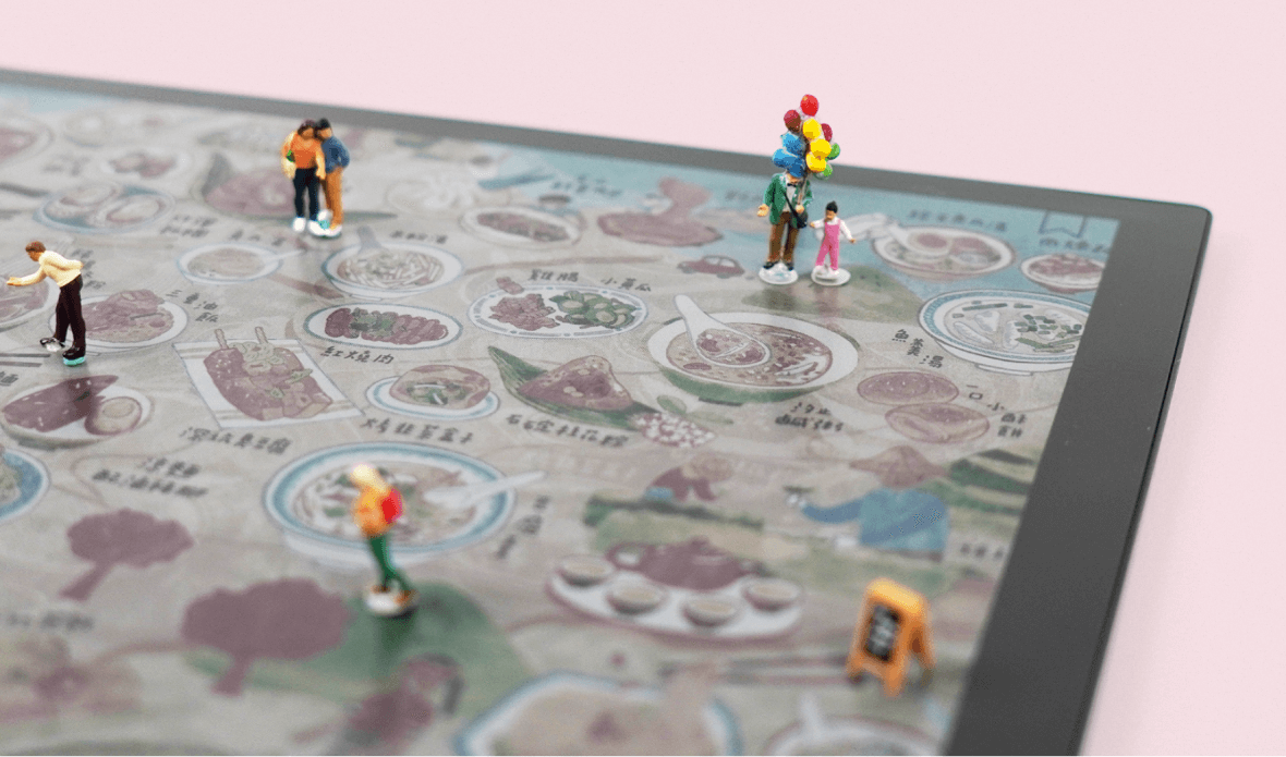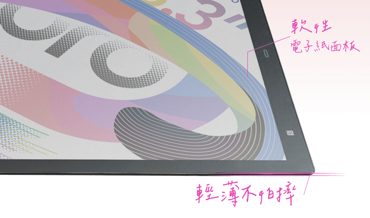 | 13.3 吋 E Ink Kaleido 3™ 彩色電子紙面板(軟性), 4096色 電容式 + 電磁式(支援電磁感應/EMR 手寫筆)雙觸控 |