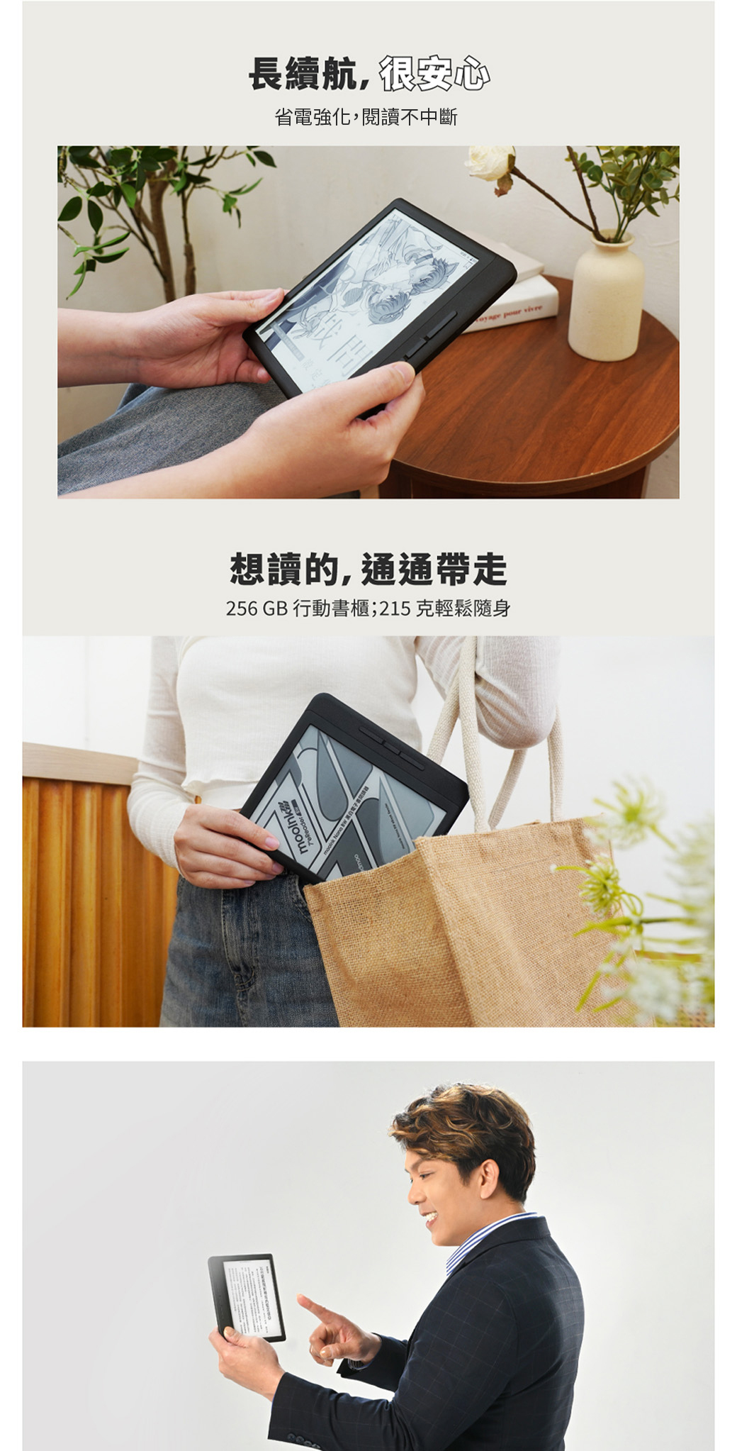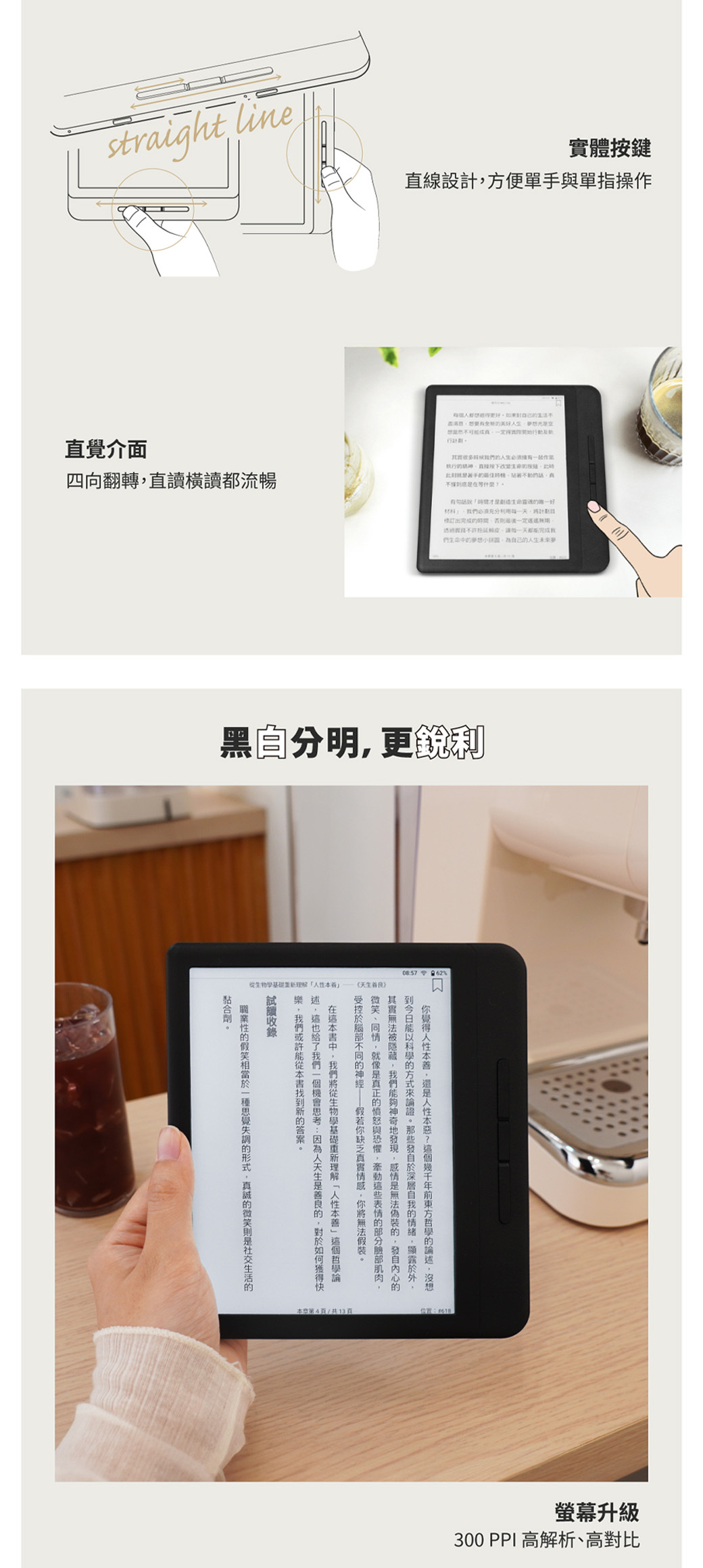 實體翻頁鍵配重力感應, 隨拿隨讀